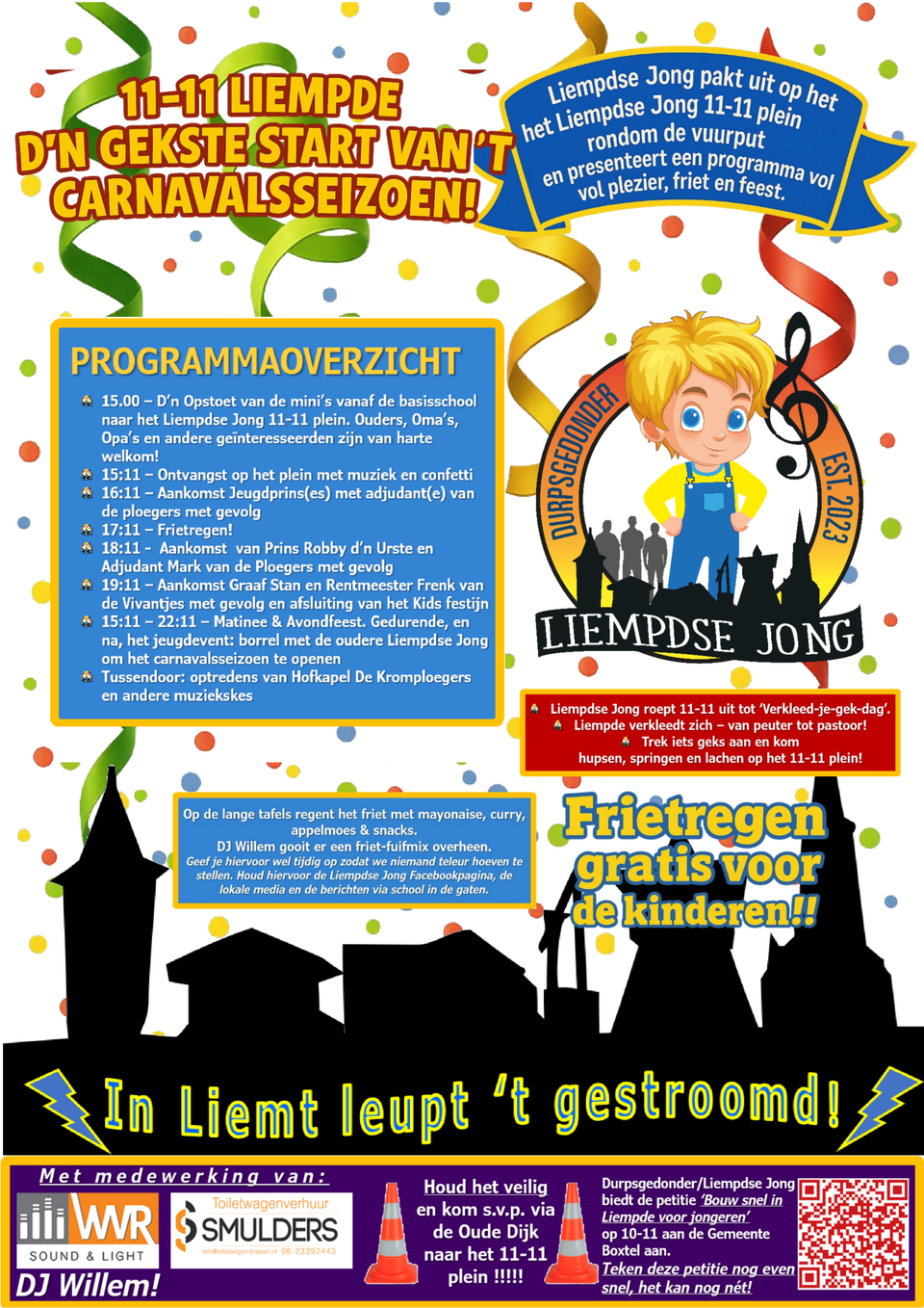 Het event is in eerste instantie gericht op de lagere schooljeugd, er komt swingende muziek (door DJ Willem van Ruremonde!) rondom de vuurput en vervolgens worden alle kinderen getrakteerd op een frietregen. Prins Robby en gevolg (van de Ploegers) en Graaf Stan en gevolg (van de Vivantjes) en gevolg zullen acte de presence geven. Hiernaast horen we geluiden dat de Kromploegers komen optreden en mogelijk ook andere muziekskes.
