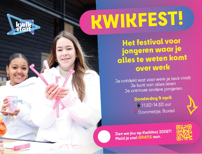 Op 9 april 2026 organiseren wij Kwikfest: hét werkfestival waar jongeren en professionals alles te weten komen over werken en WSD Kwikstart.