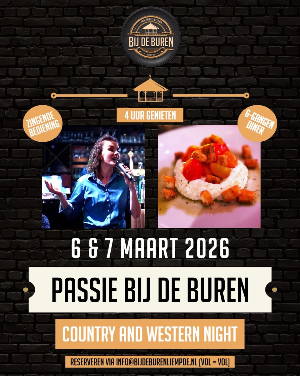 “Passie Bij De Buren” is avondvullend programma van 4 uur… wij presenteren een heerlijk 6 gangen diner, steeds bereid door een andere TOP kok die passie heeft voor zijn of haar vak. Dit in combinatie met bediening die passie heeft voor zingen en passie om jullie een fijne avond te bezorgen. Ook wisselingen in ons zangteam maakt dat iedere editie van Passie Bij De Buren een eigen identiteit heeft.