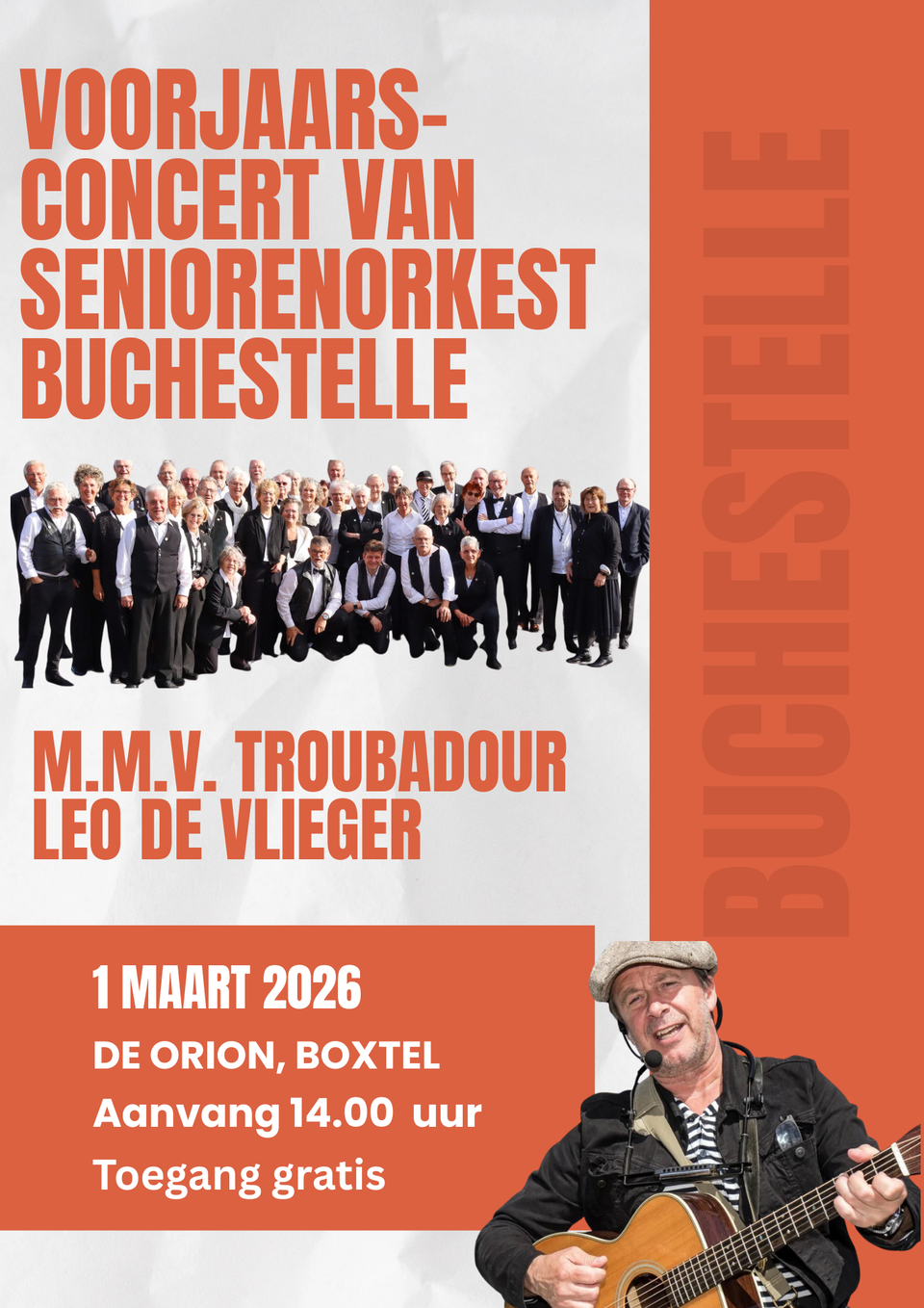 Op 1 maart verzorgt Seniorenorkest Buchestelle Boxtel i.s.m. troubadour Leo de Vlieger een muzikaal en sfeervol optreden waarin het publiek nadrukkelijk wordt uitgenodigd om mee te zingen. Met herkenbare liederen, warme klanken en een ontspannen sfeer ontstaat een samenzijn waarin muziek verbindt.